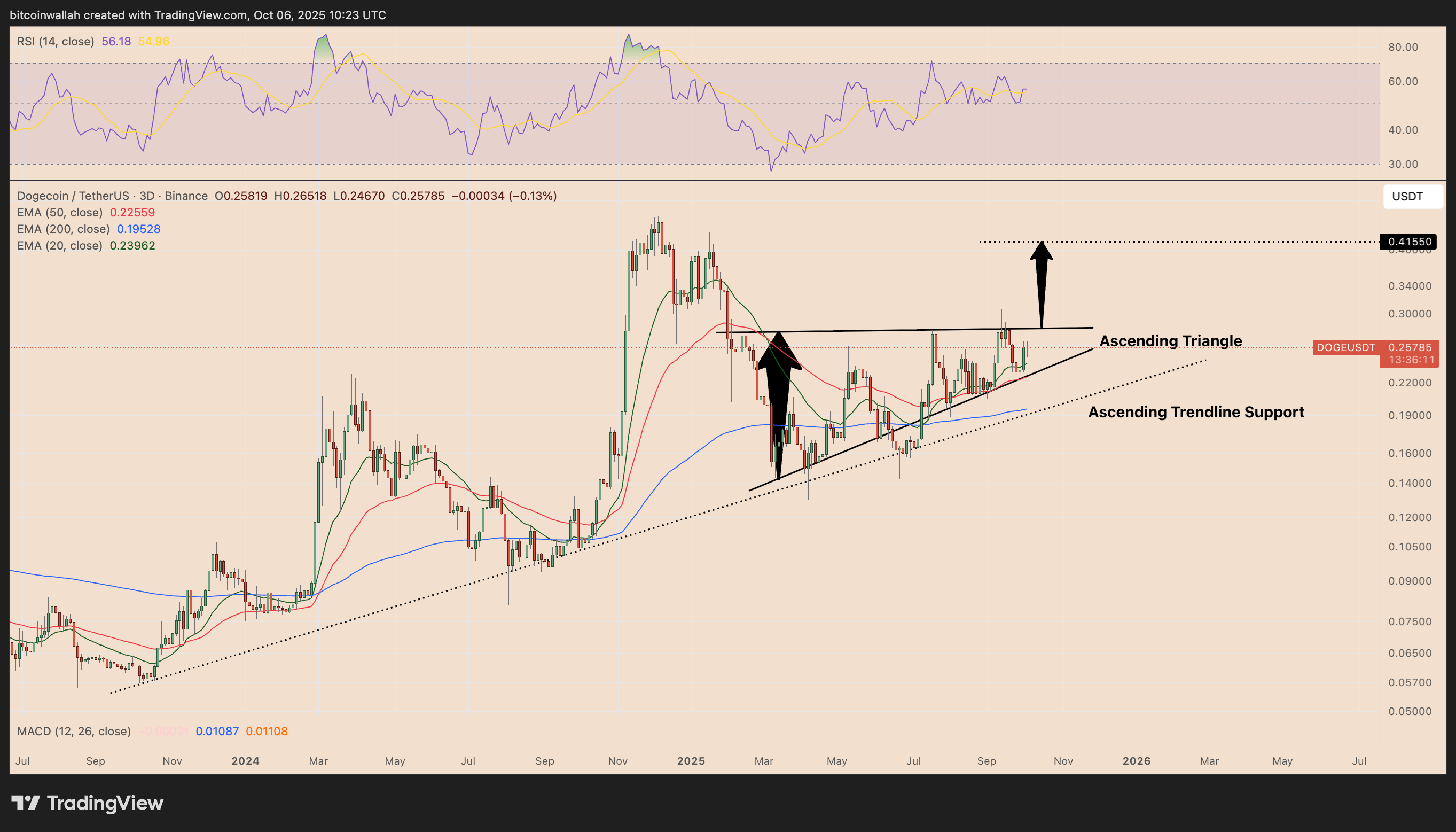 A breakout above the triangle’s upper trendline near $0.28 could confirm a bullish continuation setup, potentially targeting $0.41, up 60% from current levels, by year’s end.