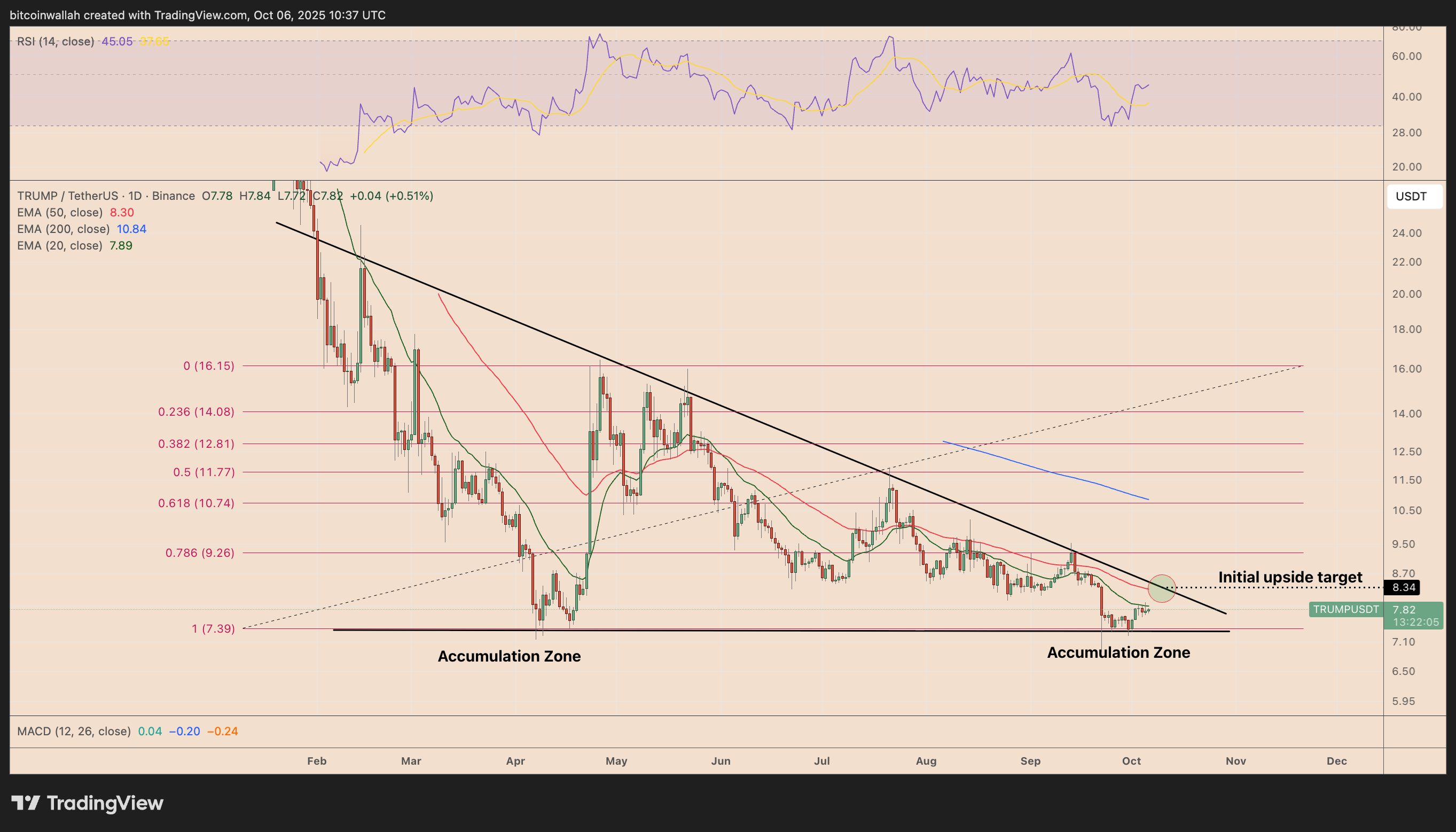 Meanwhile, TRUMP’s price is currently testing resistance from its multimonth descending trendline near $8.30–$8.35, aligning with the 20-day EMA.