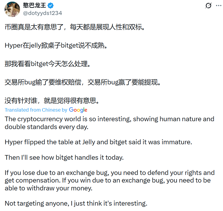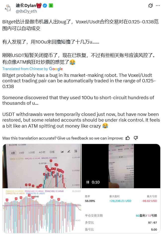 Traders who spotted the suspected bug early used high-leverage bets to boost their profits, X user Qingshui said, calling the strategy a “zero-cost exploit.” Like Dylan, Qingshui attributed the issue to a market maker bot misfiring and questioned why traders were blocked from accessing profits if the problem originated from Bitget’s side.