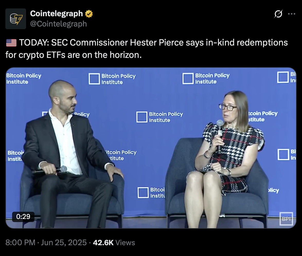In February, the SEC sought comments on a proposal to allow in-kind creations and redemptions for spot Bitcoin (BTC) and Ether (ETH) ETFs. During a panel at the Bitcoin Policy Institute on Wednesday, US Securities and Exchange (SEC) Commissioner Hester Pierce said in-kind redemptions for crypto ETFs are on the horizon.