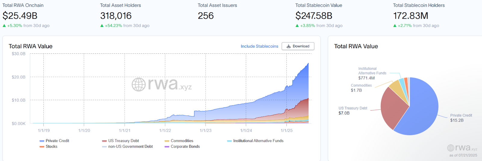 Onchain RWAs reached a cumulative all-time high of over $25.4 billion across 318,000 total asset holders, excluding the value of stablecoins, according to data from RWA.xyz.