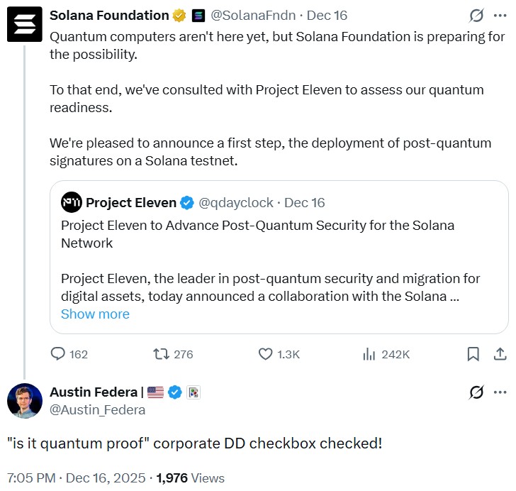 Quantum resistance is increasingly being treated as a due diligence consideration by investors. Source: Solana/Austin Federa