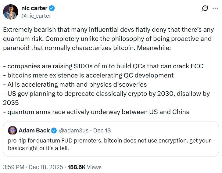 On the other side, investors and researchers argue that even a low-probability outcome matters for an asset whose value depends on long-term confidence. Castle Island Ventures partner Nic Carter has described the outright dismissal of quantum risk by influential developers as bearish.