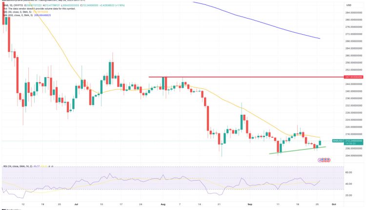 The price of Binance Coin (BNB) has climbed by almost 2% in the past 24 hours, with its move to $212.46 coming as the wider crypto market rises by a more modest 1%.