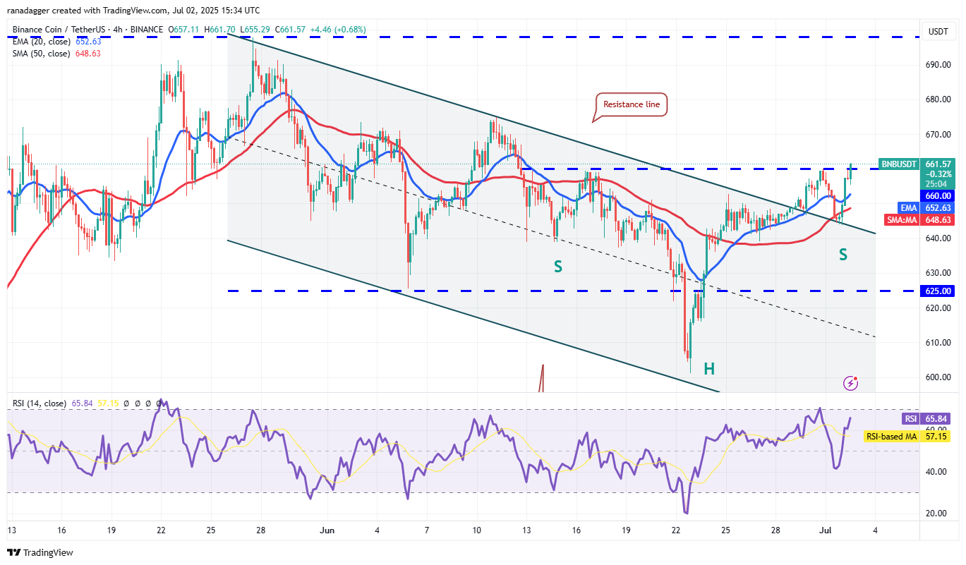 The 20-day exponential moving average ($648) is flattish, but the relative strength index (RSI) is just above the midpoint, indicating a slight momentum in favor of the bulls. If buyers sustain the price above $660, the BNB/USDT pair could climb to $675 and later to $698. Sellers are expected to fiercely defend the $698 resistance because a break above it opens the gates for a rally to $732.