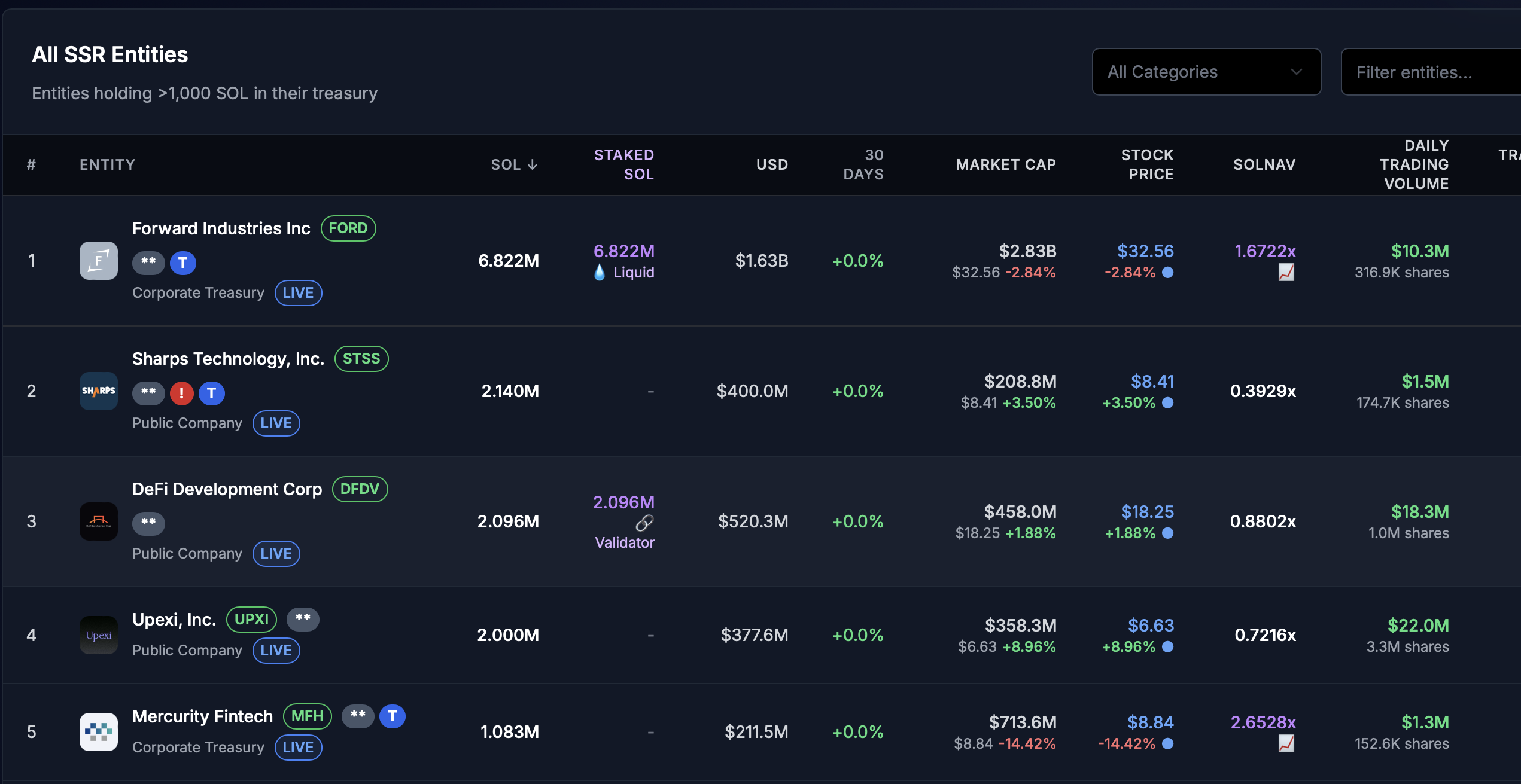 Leading the pack is Forward Industries, holding 6.82 million SOL worth about $1.63 billion at current prices, followed by Sharps Technology with 2.14 million SOL and DeFi Development Corp with 2.10 million SOL.