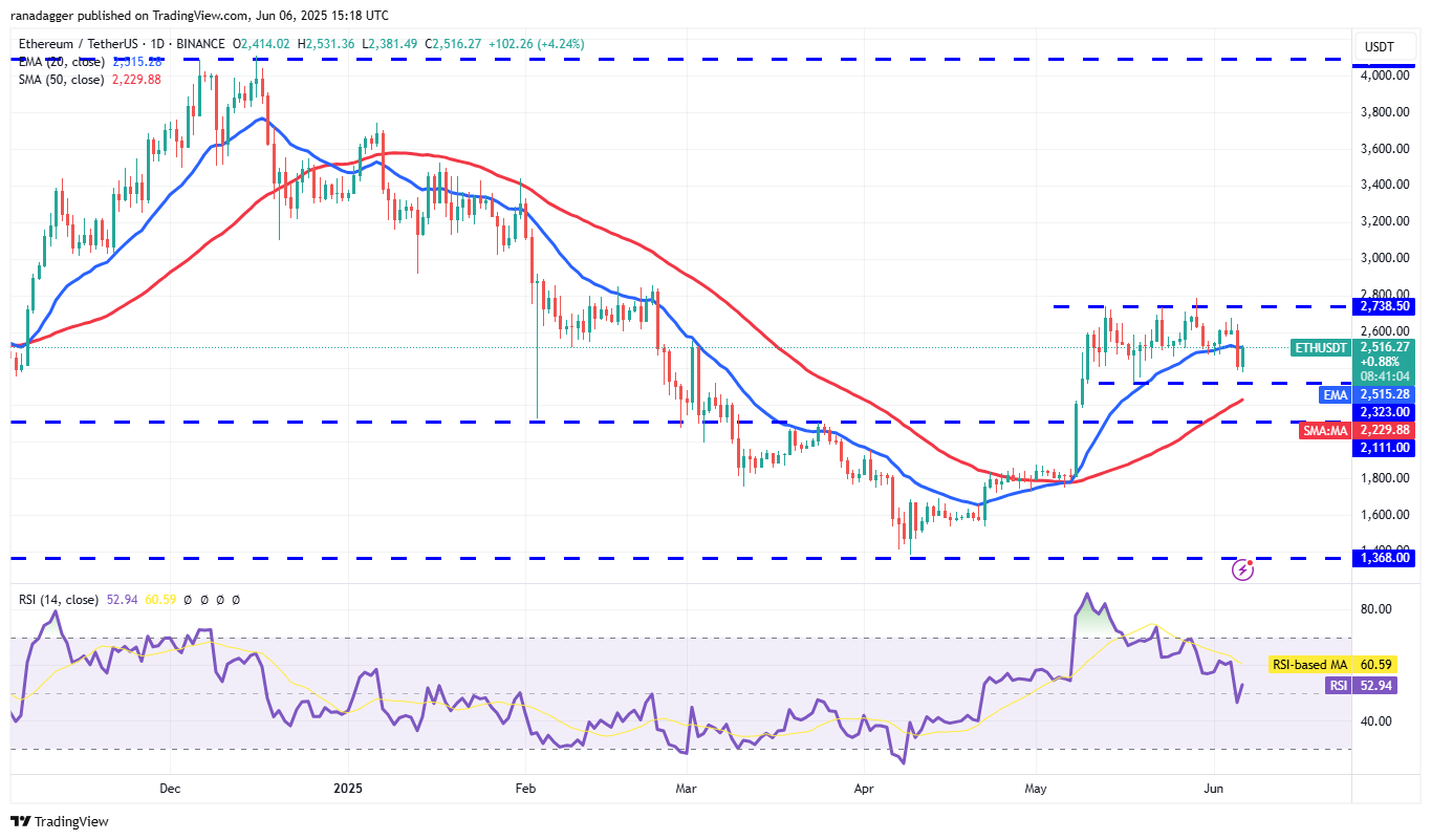 Ether (ETH) turned down and slipped below the 20-day EMA ($2,515) on June 5, suggesting that short-term buyers are booking profits.
