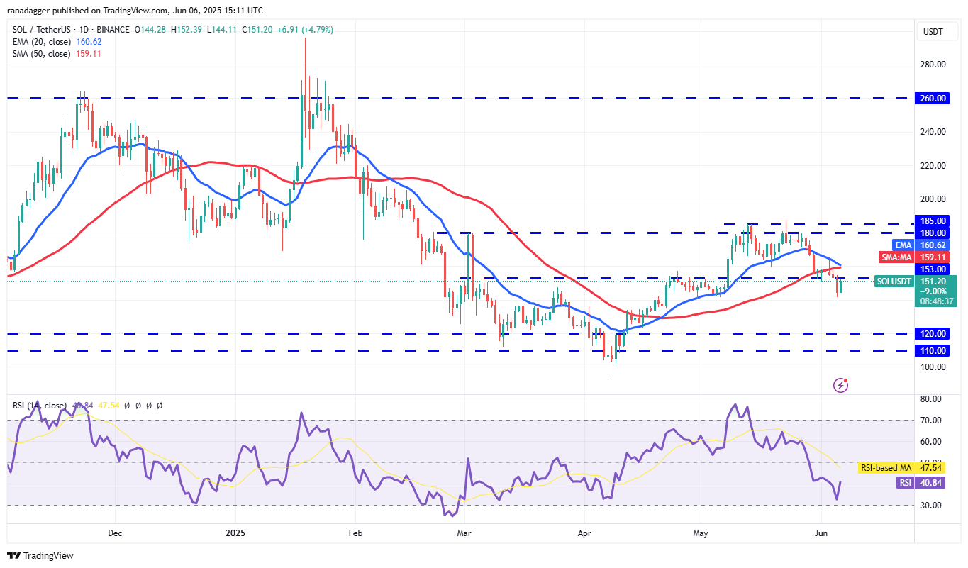 Solana’s (SOL) failure to rise above the 20-day EMA ($160) on June 3 attracted sellers, pulling the price below the $153 support on June 5.