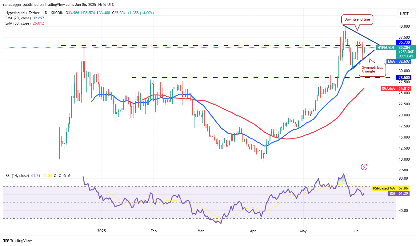 Sellers pulled Hyperliquid (HYPE) back below $35.73 on June 4, but the bulls successfully defended the 20-day EMA ($32.69) on June 5.