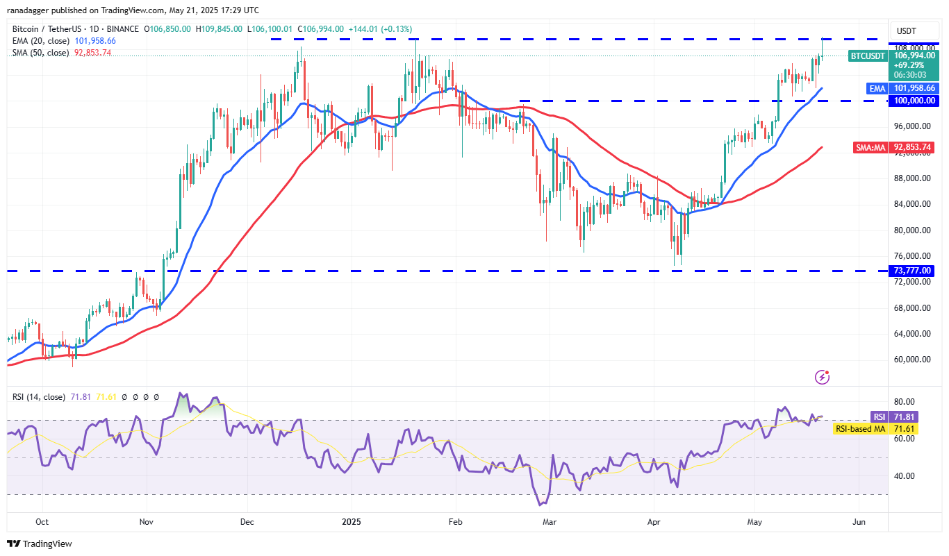 The upsloping moving averages and the relative strength index (RSI) in the overbought zone indicate that the bulls are in control. If the price closes above $109,588, the BTC/USDT pair could pick up momentum and skyrocket toward $130,000.
