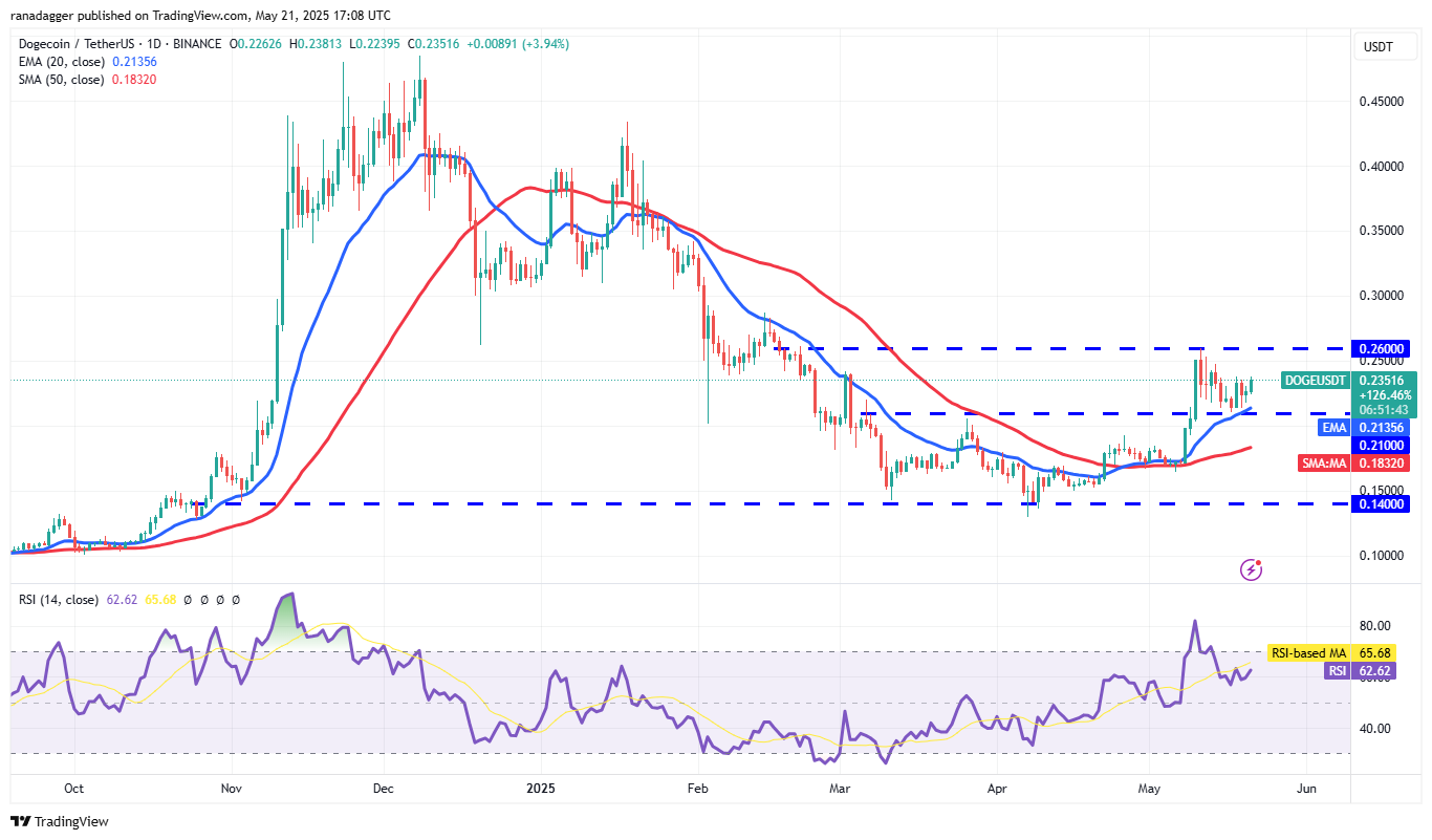 The 20-day EMA ($0.21) is trending up, and the RSI is in the positive zone, signaling that buyers are in command. The DOGE/USDT pair could rally to the $0.26 level, which could attract sellers. If the price turns down sharply from the overhead resistance, the pair could form a narrow range between $0.26 and $0.21 for some time.