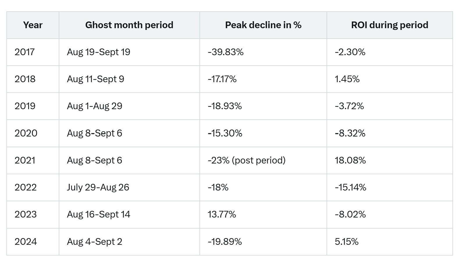 While some years have ended ghost month with positive ROI, the recurring mid-period volatility means traders should remain cautious. Any deeper correction into late August could set the stage for a stronger recovery in Q4, after testing the resolve of short-term bulls.