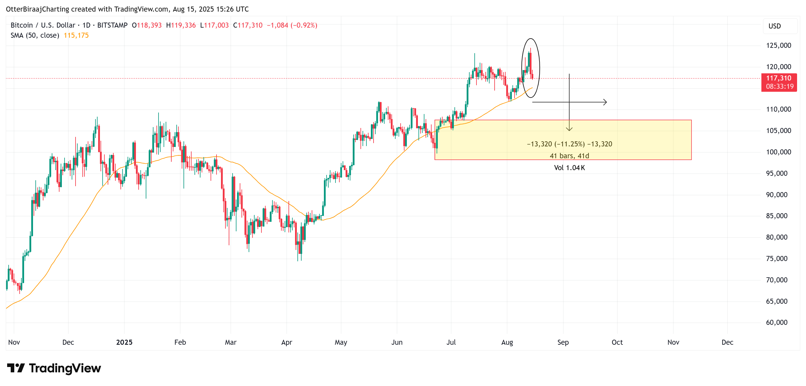 Bitcoin (BTC) saw a sharp correction on Thursday, slipping below $117,000 on Aug. 14, marking its steepest pullback in a month. The daily chart flashed a bearish engulfing pattern for the first time since July 15, raising concerns that seasonal weakness during Asia’s “ghost month” could extend the downturn.