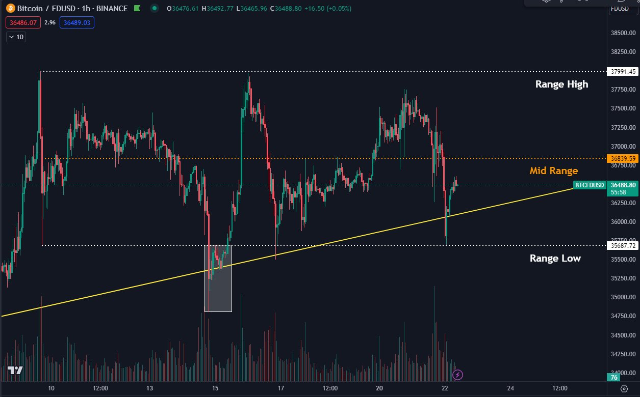 Daan Crypto Trades showed BTC/USD respecting a trading range in place for two weeks despite dipping to $35,600 after the Binance event.