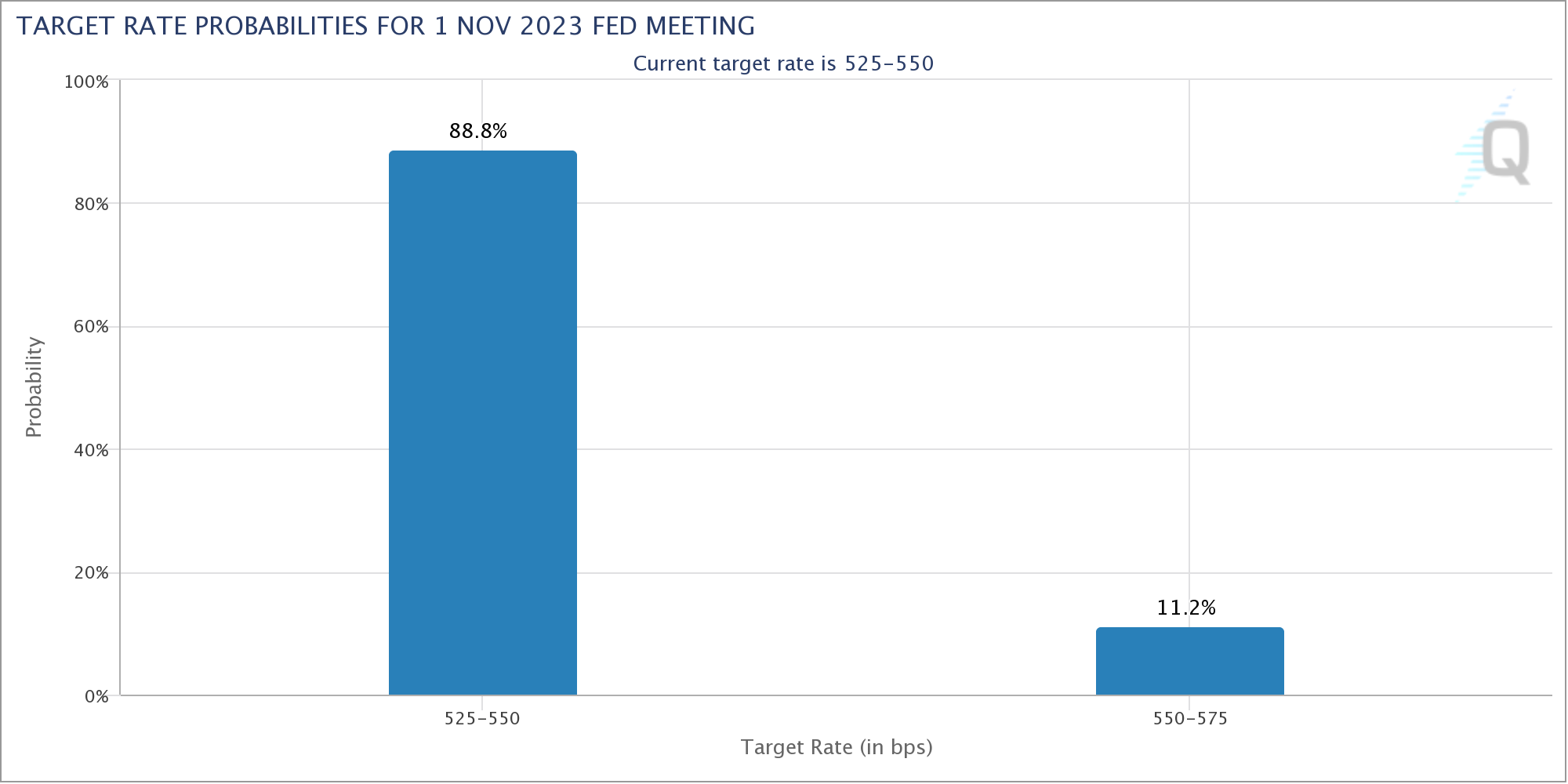 Per the latest data from CME Group’s FedWatch Tool, market odds of rates remaining at current levels at the next meeting of the Federal Open Market Committee (FOMC) on Nov. 1 were nonetheless at 88% — versus a mere 11% chance of a further hike.