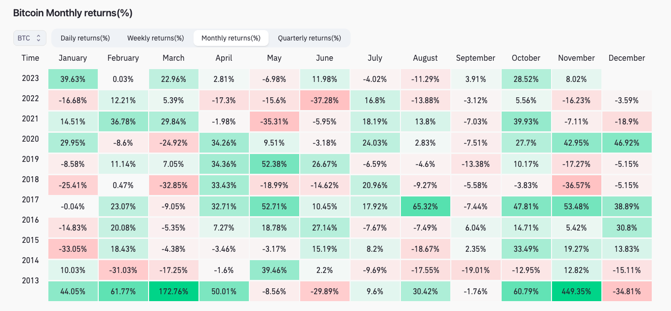 With the monthly close just days away, Bitcoin is currently up 7.8% month-to-date, making November 2023 thoroughly average compared to years gone by.