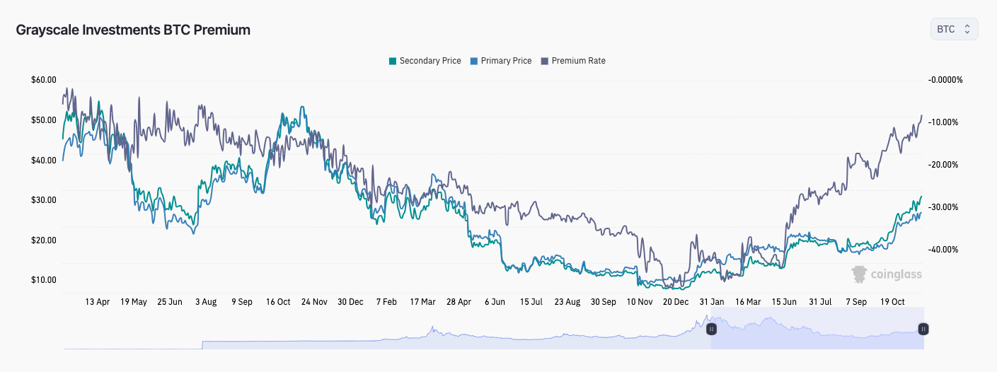 Once nearly 50% lower, the GBTC share price had a mere 8% discount to net asset value, or NAV, as of Nov. 24, per CoinGlass data.