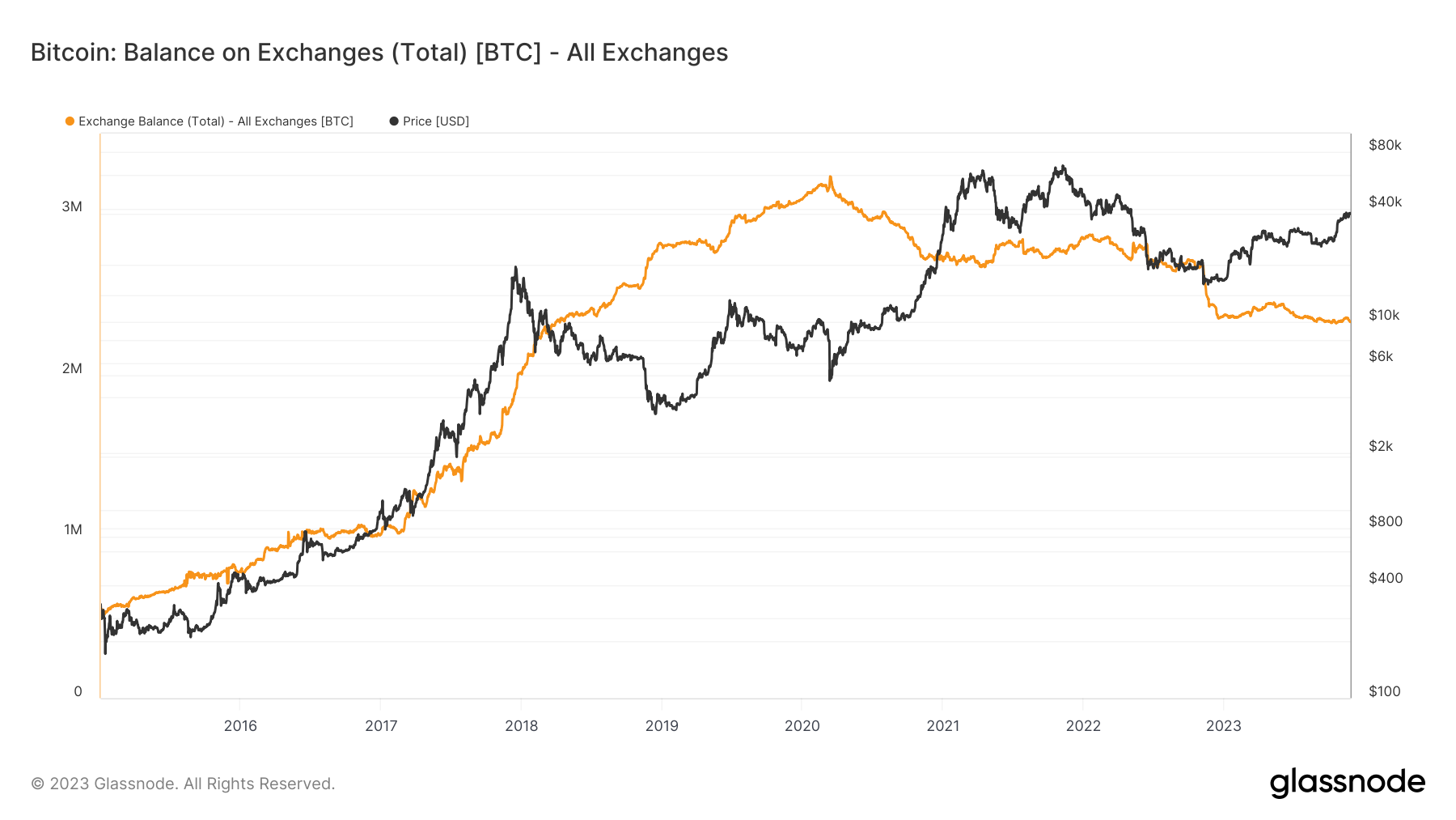 According to the latest data from on-chain analytics firm Glassnode, the combined holdings of the major exchanges totaled 2.332 million BTC as of Nov. 26.