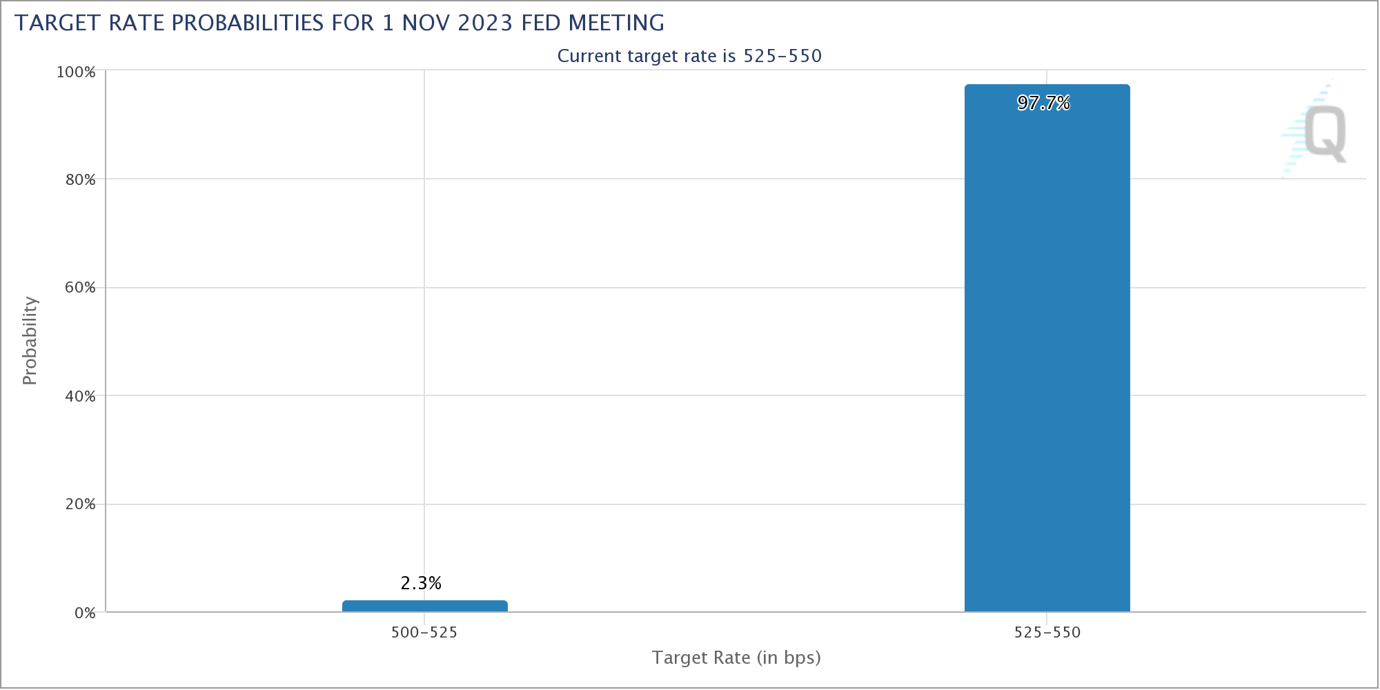 According to the latest data from CME Group’s FedWatch Tool, the odds of that eventuality currently lie at nearly 98%.