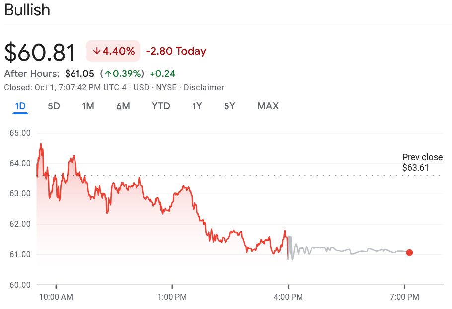 Despite the news, Bullish (BLSH) shares fell 4.4% to $60.80 during Wednesday’s trading hours, Google Finance data shows.