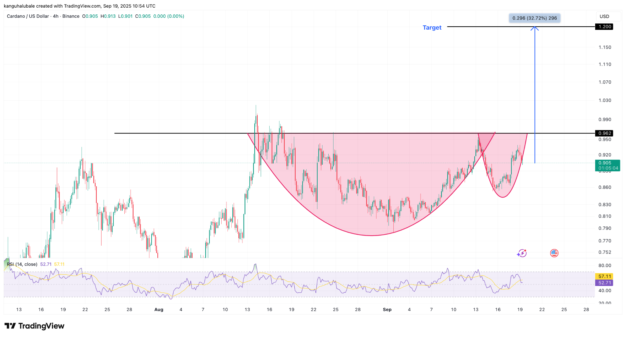 ADA’s price is also seeking a breakout from a cup-and-handle pattern on the four-hour chart, as shown below. Bulls will now attempt to push the price above the pattern’s neckline at $0.96, confirming a bullish breakout.