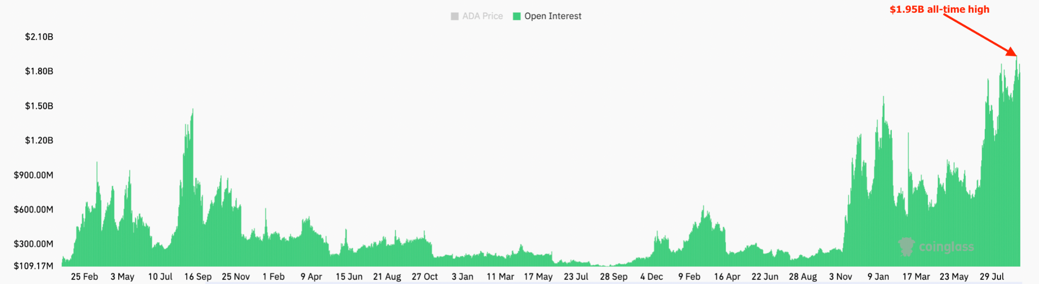 Cardano’s open interest (OI) in futures markets hit an all-time high of $1.95 billion on Sunday, signaling strong speculative interest in the derivatives market.