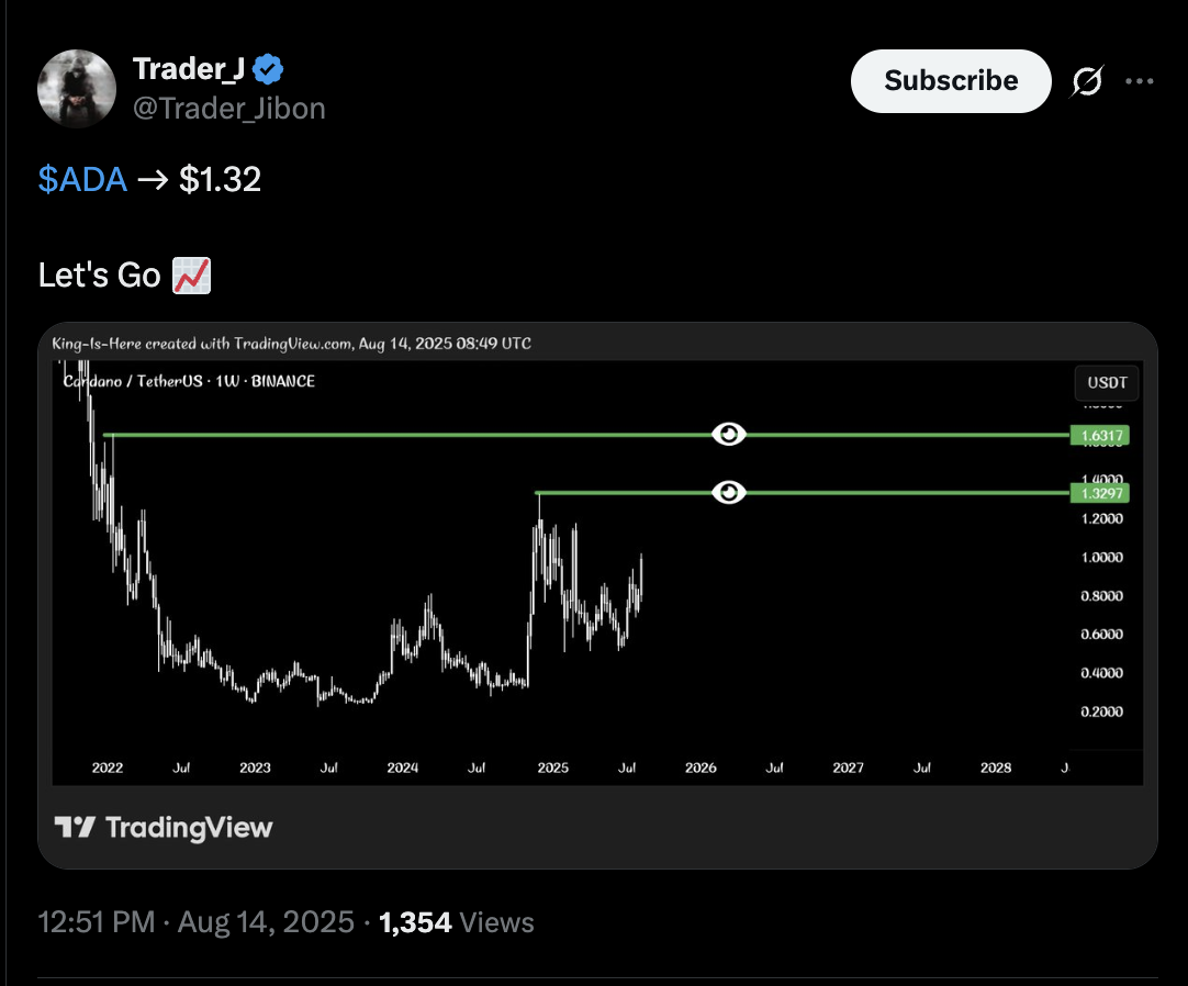 That includes Trader_Jibon, who predicts ADA’s price to reclaim its November top at around $1.32 —and mid-2022 high of $1.63 afterward.