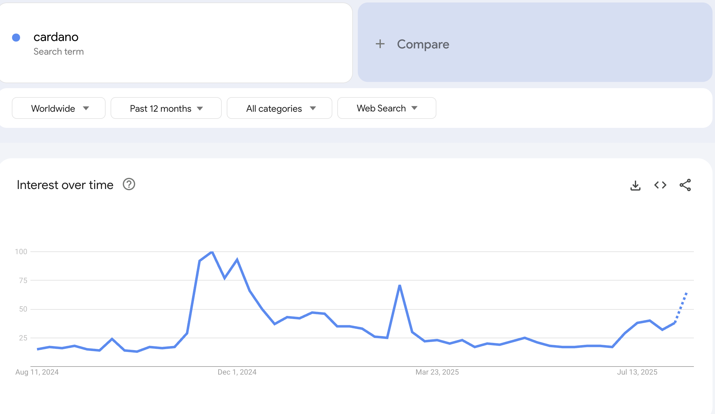 Google Trends data reveals searches for “altcoin” have climbed to their highest level since 2021, while “Cardano” interest is at a five-month peak.