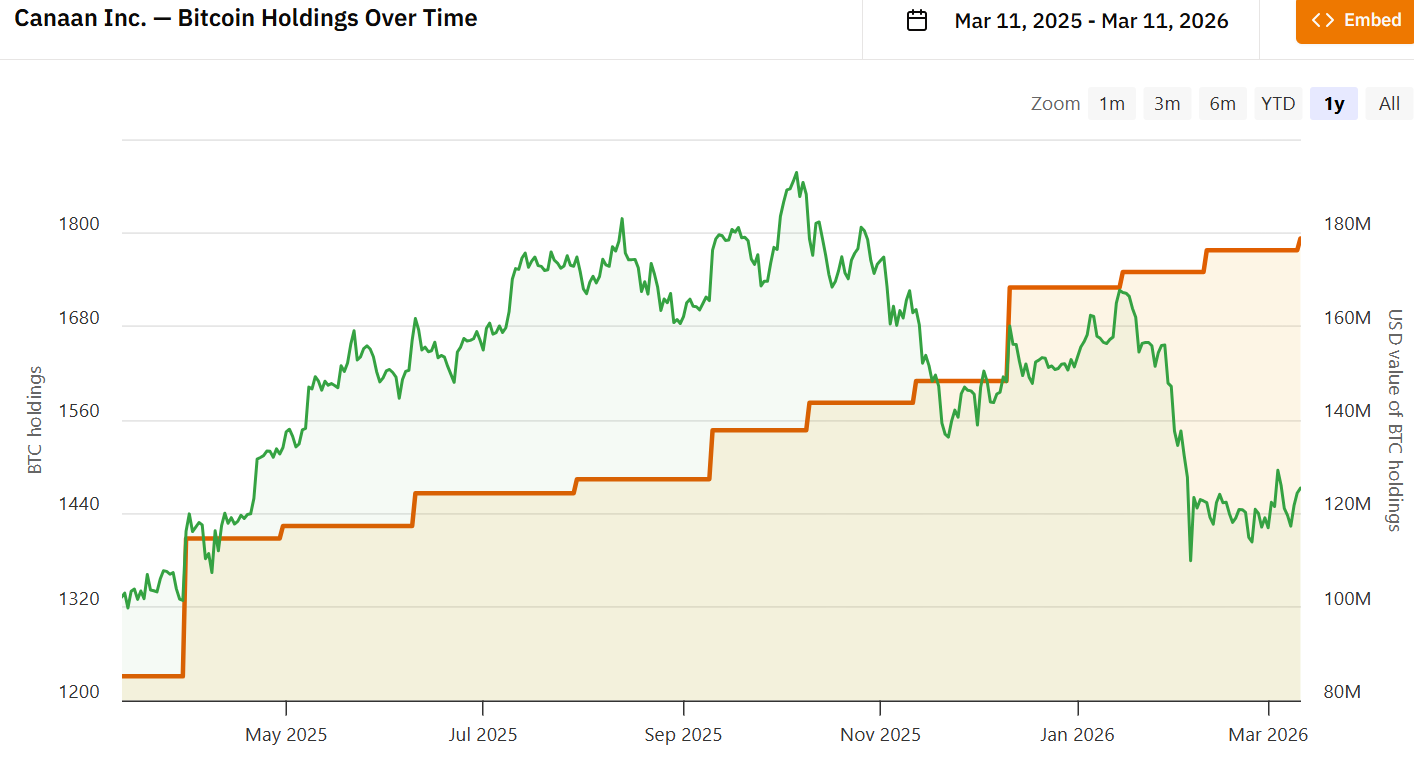 The company mined 86 BTC in February, increasing its total Bitcoin holdings to 1,793 BTC. Canaan also reported holding 3,952 Ether (ETH), bringing its total crypto reserves to record levels.