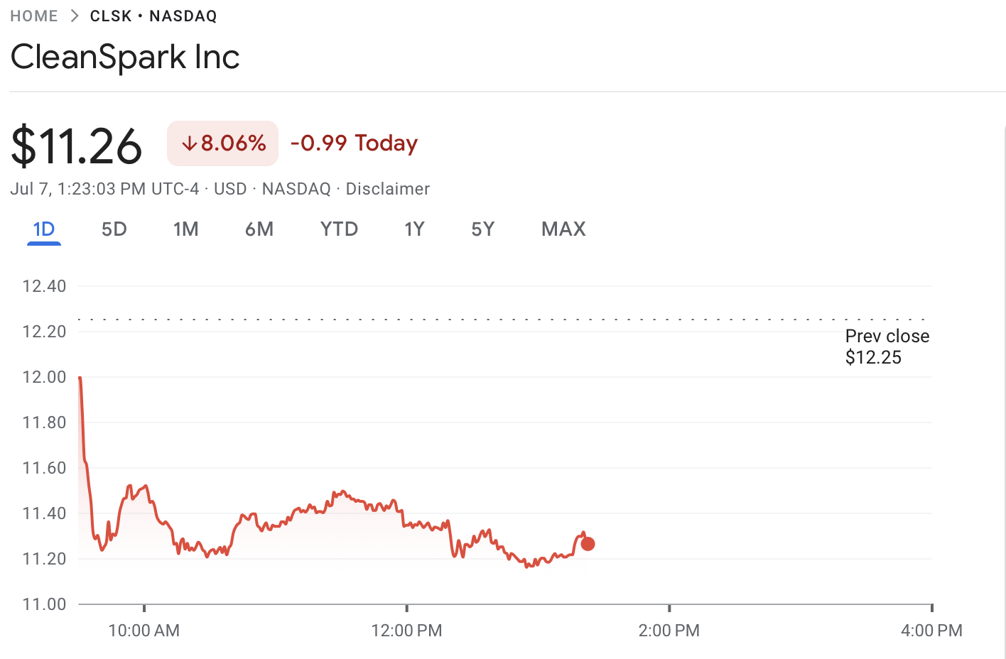 CleanSpark’s shares on the Nasdaq are losing ground on Monday, dropping 8% at the time of this writing. The company’s stock follows a broader market trend, with the Nasdaq index falling over 1% amid talks on trade deals by the US government.