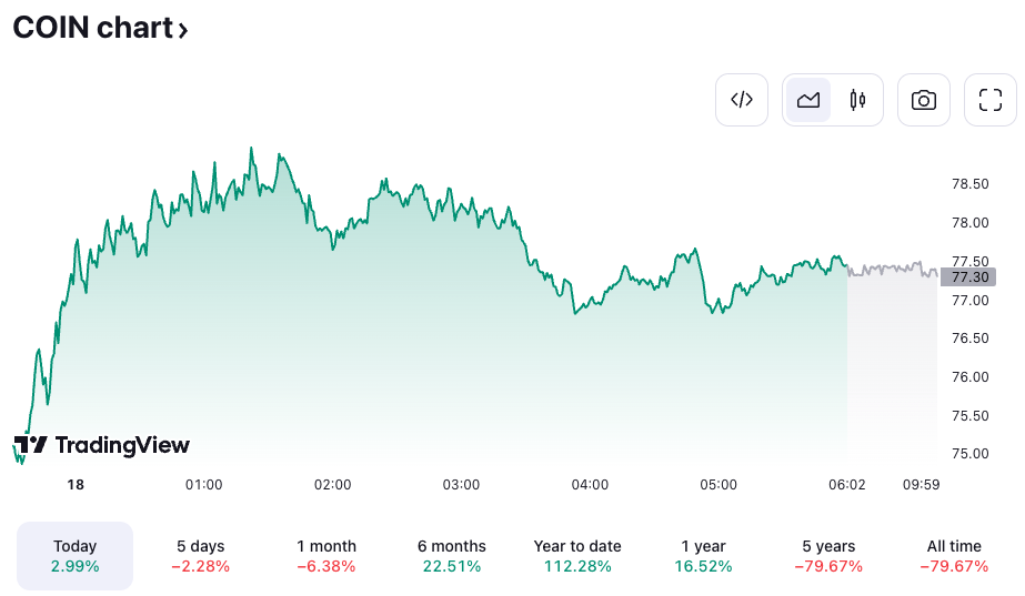 Coinbase shares were trading at $77.30, up 3% on the day, according to data from TradingView at the time of publication.
