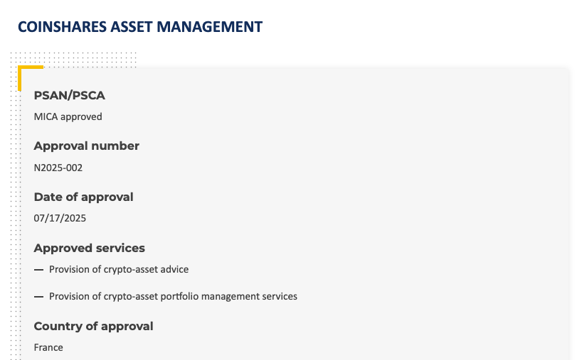 CoinShares stressed that its MiCA license enables it to provide services across several EU jurisdictions, with operations currently passported in France, Germany, Cyprus, Ireland, Lithuania, Luxembourg, Malta and the Netherlands.