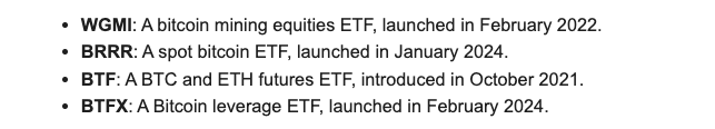 The other funds include the CoinShares Bitcoin Mining ETF (WGMI) launched in February 2022, the spot Bitcoin ETF, CoinShares Bitcoin ETF (BRRR), and the Bitcoin Futures Leveraged ETF (BTFX), launched in January 2024 and February 2024, respectively.
