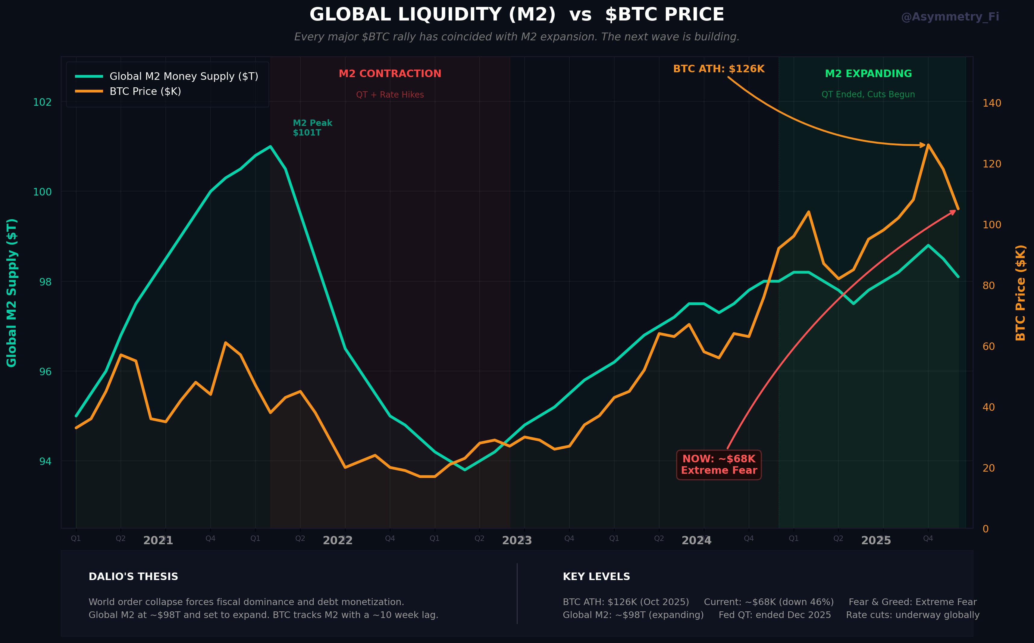 According to ex-fund manager Asymmetry, every major BTC rally has coincided with M2 expansion, and “the next wave is building.”