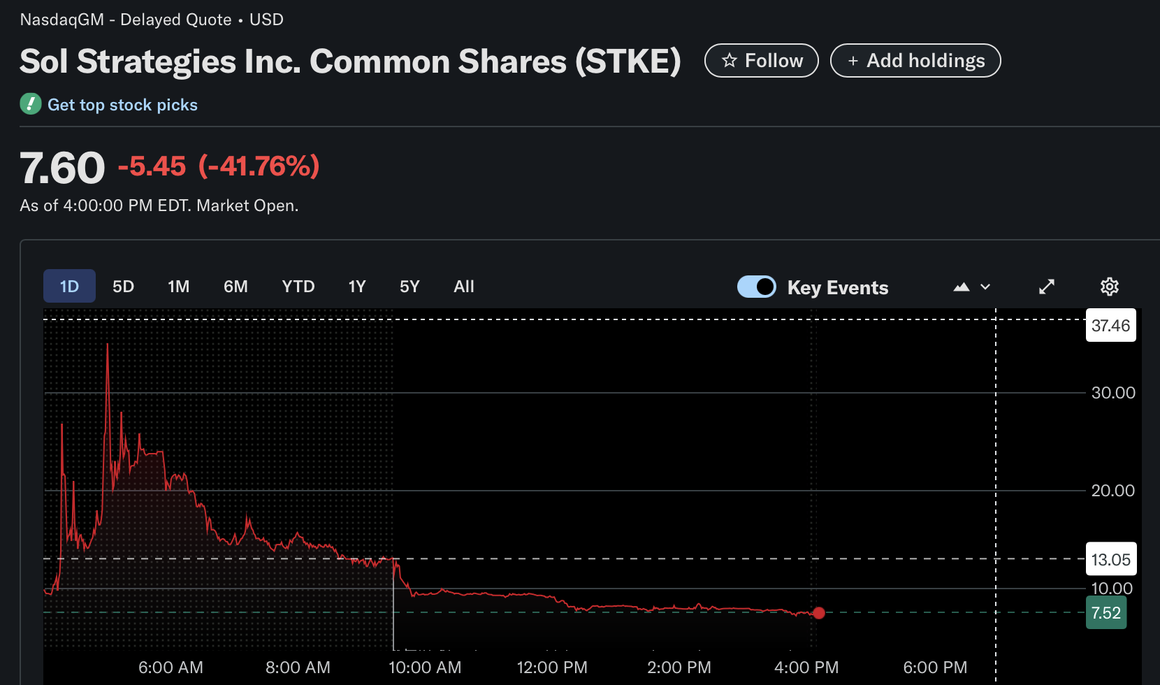 Meanwhile, Sol Strategies, a Canadian Solana treasury and staking company, saw its stock move in the opposite direction. Newly listed on the Nasdaq, its shares plunged 42% on Tuesday. Trading on the Canadian Securities Exchange fared slightly better but still dropped by 16%.