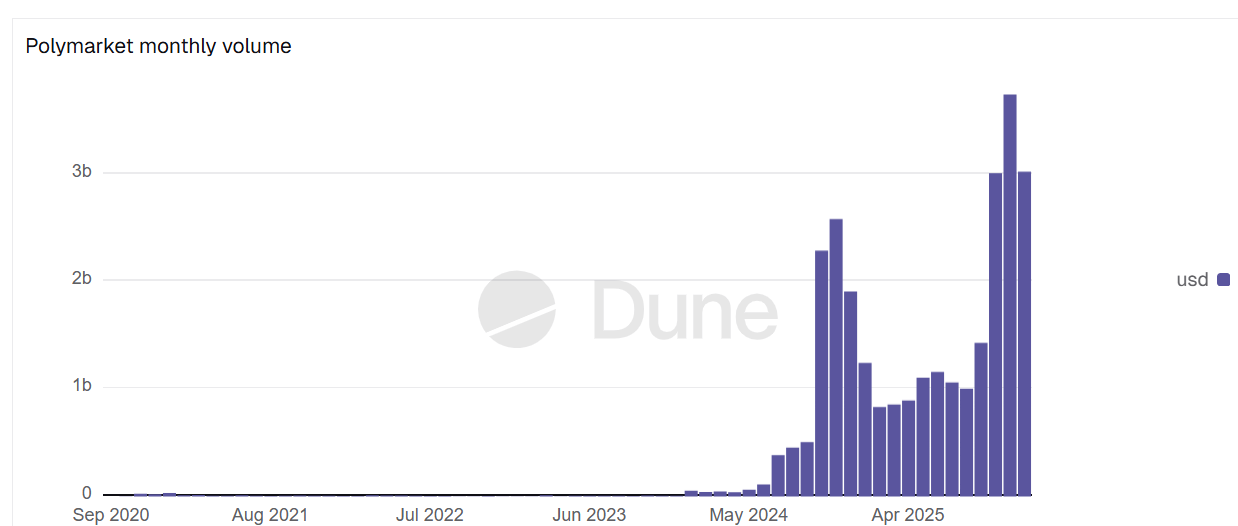 Polymarket’s monthly volumes began to surge in the run-up to the 2024 US presidential election. Source: Dune