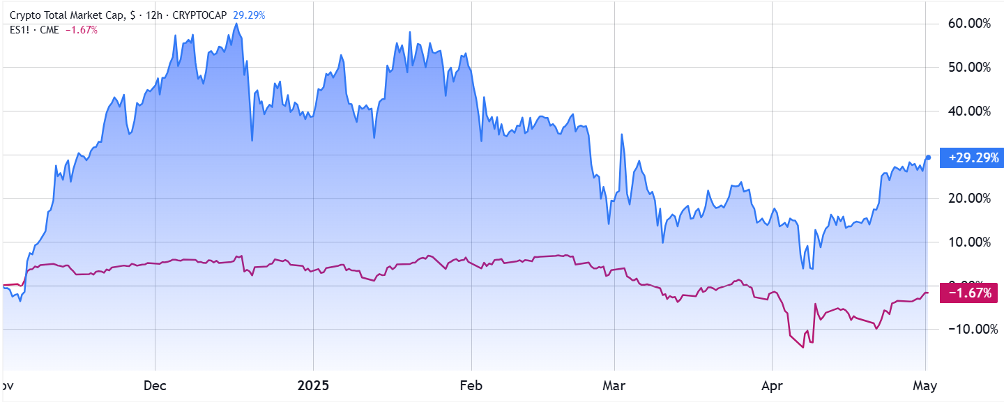 Despite the short-term correlation, the cryptocurrency market has outperformed equities in recent months. Since March, the total crypto market capitalization has risen by 8.5%, while the S&P 500 has declined by 5.3%. Over a six-month period, this divergence becomes even more pronounced: the total crypto market cap is up 29%, while the S&P 500 is down 2%. It is therefore inaccurate to suggest that these markets move in perfect synchrony, particularly when viewed over longer timeframes.