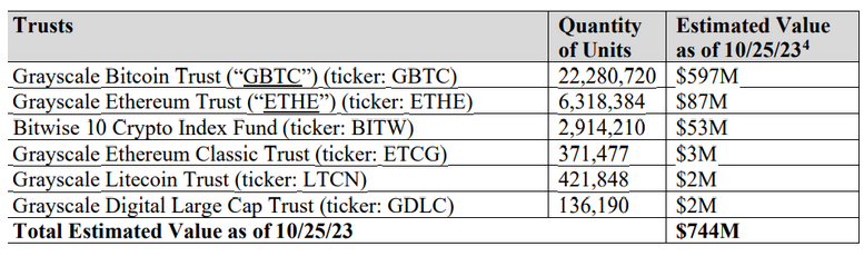 While the court document references a total of $744 million in assets — this is due to the valuation figure being as of Oct. 25, 2023. The assets have increased in value since.