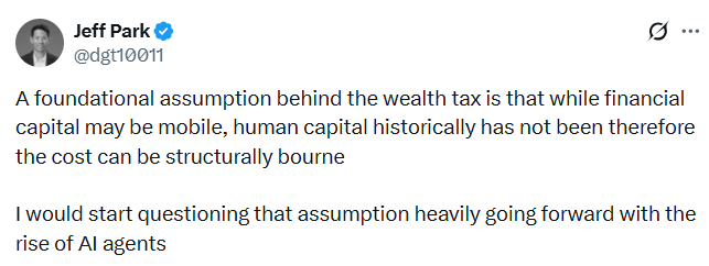 “It seems to me that capital is more mobile than ever, and one time wealth taxes are a signal to capital — like a sovereign default — that more can be expected in the future,” he added.