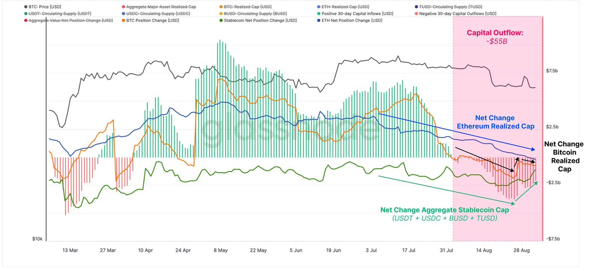 With about $55 billion being drained from the crypto markets over the past month, capital outflows did not just affect Bitcoin (BTC) but also impacted Ether (ETH) and stablecoin liquidity.