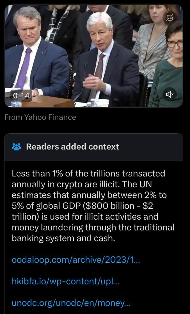 Dimon’s comments triggered a Community Notes fact check on X, stating that less than 1% of cryptocurrency transactions are illicit.