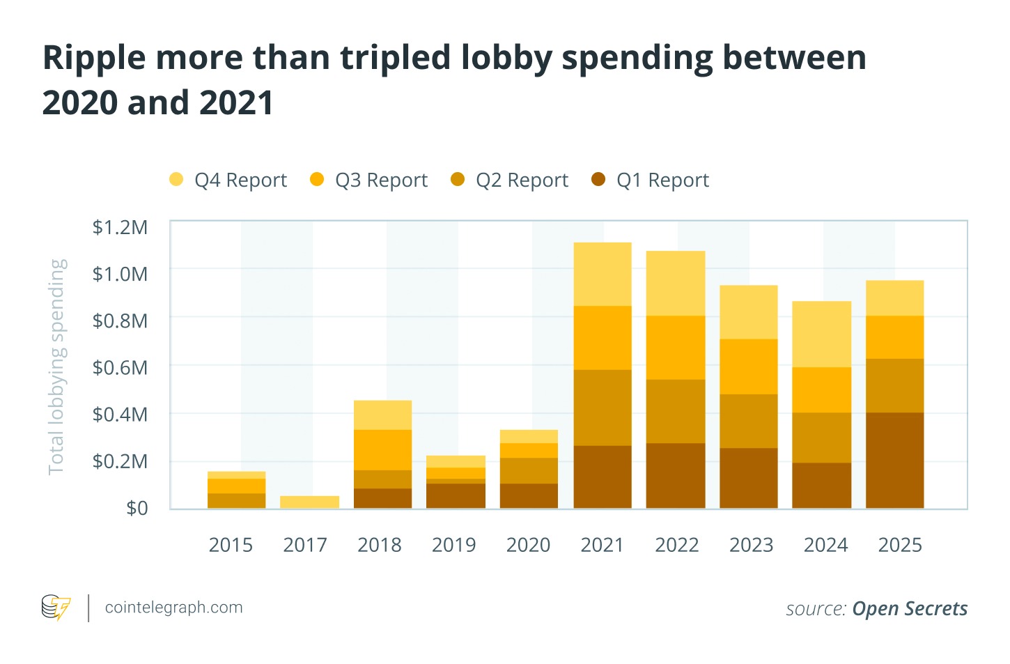 At the same time, crypto increased its lobbying efforts in Washington. Major platforms like Coinbase and fintech developers like Ripple padded their budgets as the industry gained visibility.