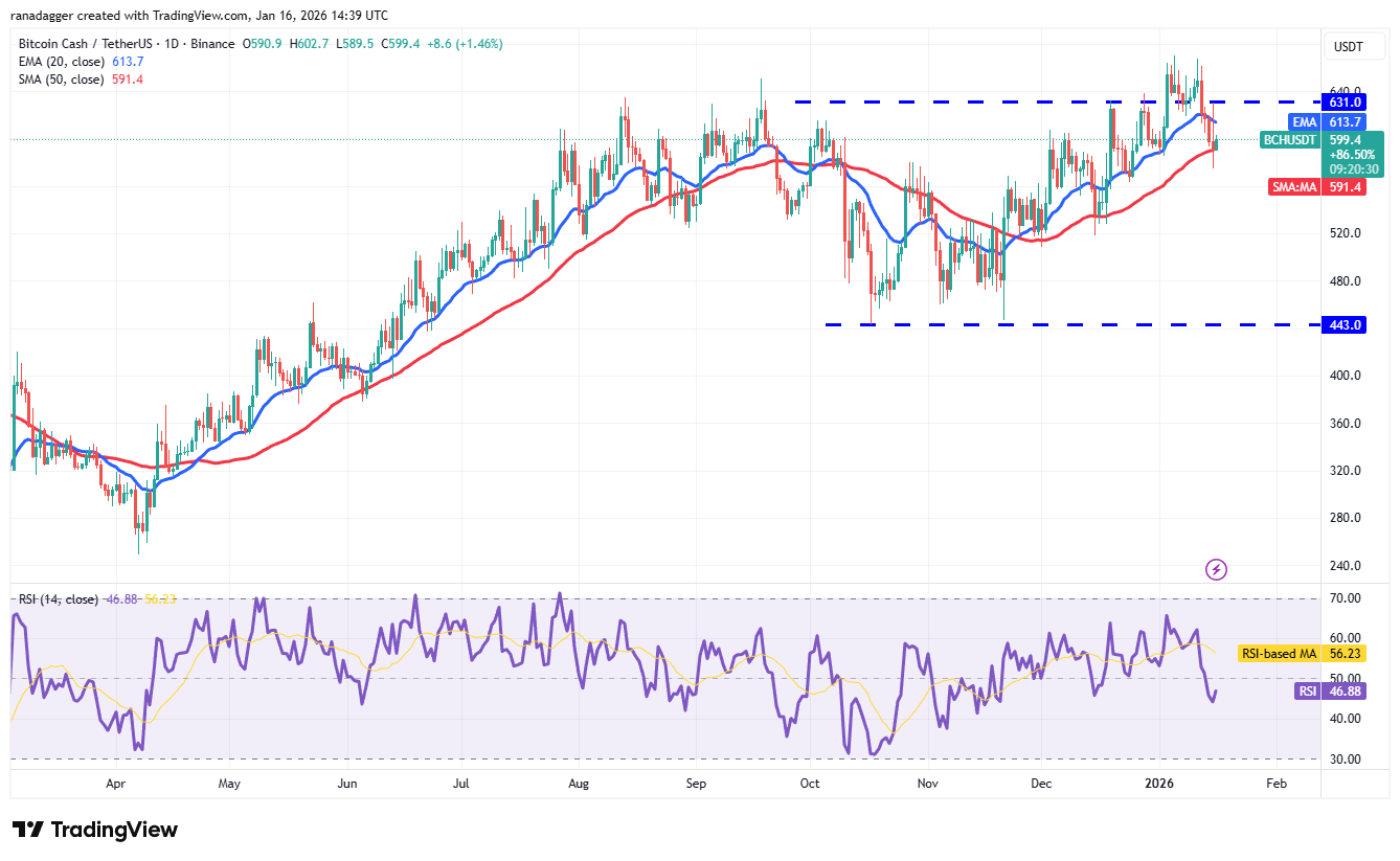 The 20-day EMA ($613) has started to turn down, and the RSI is in negative territory, indicating a slight edge to the sellers. If the price sustains below the 50-day SMA ($591), the BCH/USDT pair may slump to $563 and then to $518.