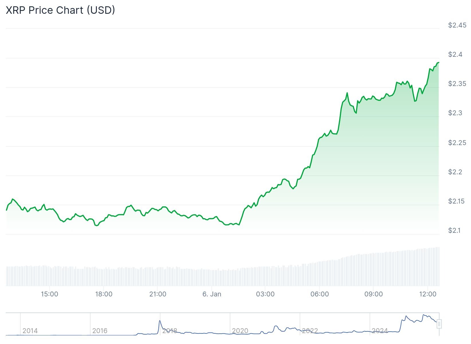 Ether (ETH), meanwhile, hit a daily high of over $3,200, its highest price in over three weeks, while XRP (XRP) soared by nearly 12% on the day to $2.39, its highest since mid-November.