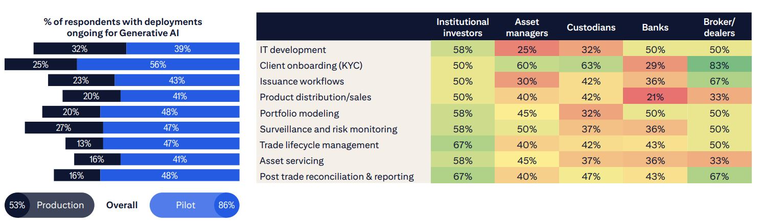 At least 67% of institutional investors indicated they use GenAI for post-trade reconciliation, reporting, clearing, and settlements.