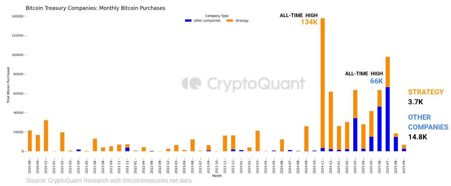 The number of purchases per month is also up, but CryptoQuant said the total amount of Bitcoin bought by the companies slowed in August to below this year’s monthly average, and the firms are scooping up less Bitcoin per transaction.
