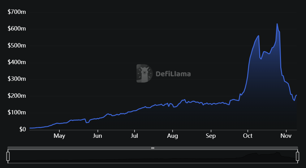 Momentum’s TVL peaked above $600 million in late October. Source: DefiLlama