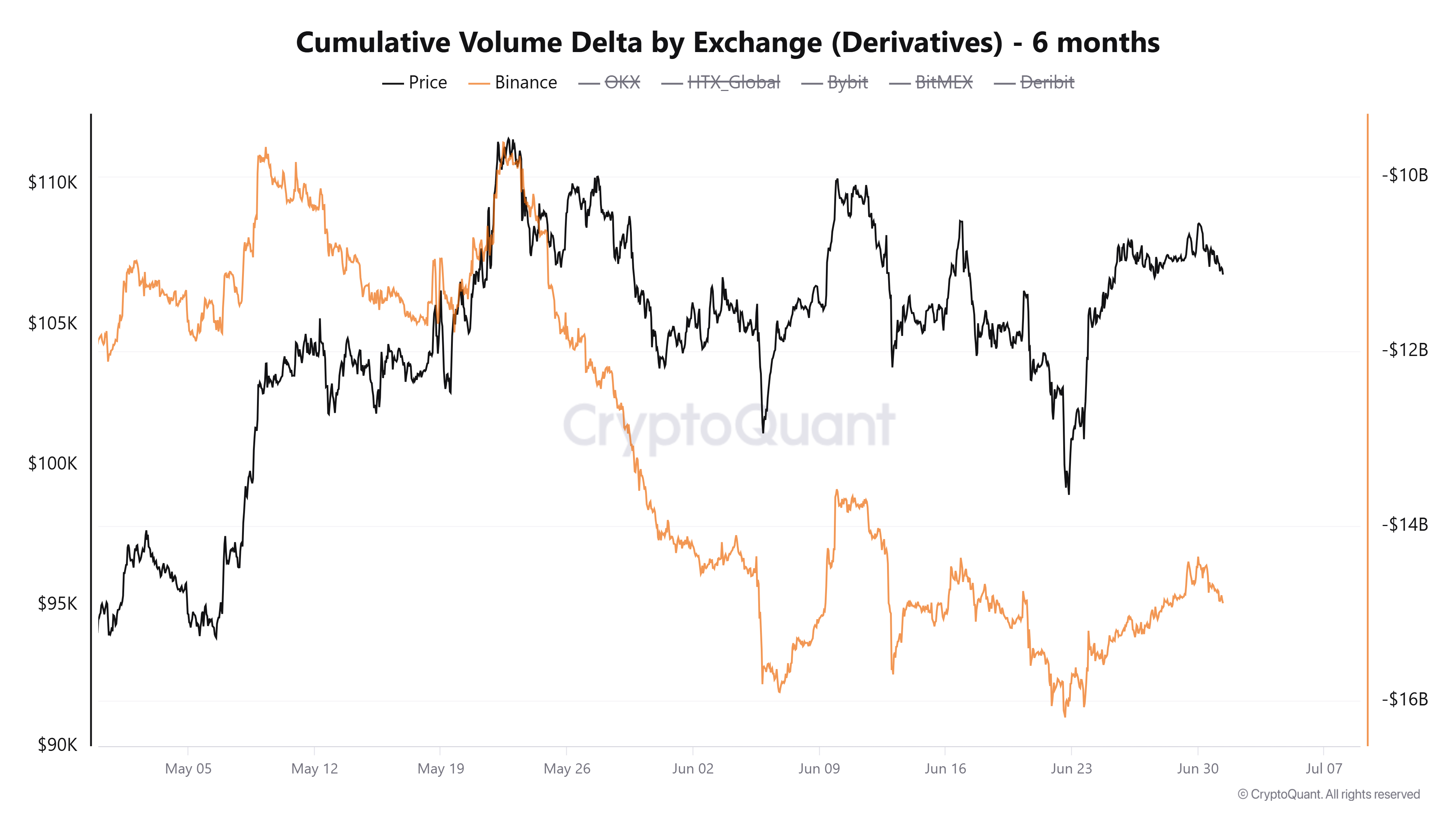 Despite sustained sell-side aggression on Binance derivatives over the past 45 days, Bitcoin has held its ground within a tight $100,000–$110,000 range. Cumulative Volume Delta (CVD) data remains negative, signaling consistent short-selling pressure from takers. Yet, the inability of the price to break lower suggests that this flow is being absorbed, implying accumulation.