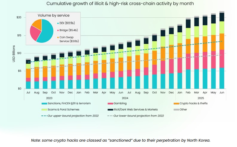 According to UK blockchain analytics firm Elliptic, illicit and high-risk cryptocurrency flowing through crosschain swaps has surged to an estimated $21.8 billion in 2025, up from $7 billion in 2023. North Korean actors account for roughly 12% of these transactions.