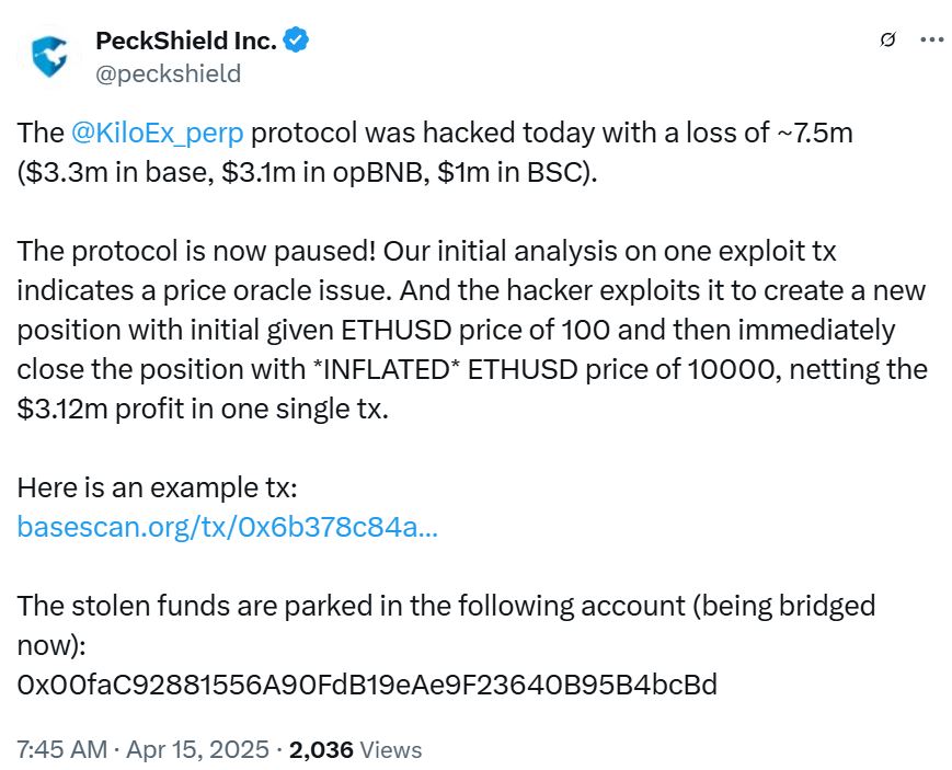 The exploit has been contained, with use of the platform suspended and an investigation underway, the KiloEX team said in an April 14 statement to X.